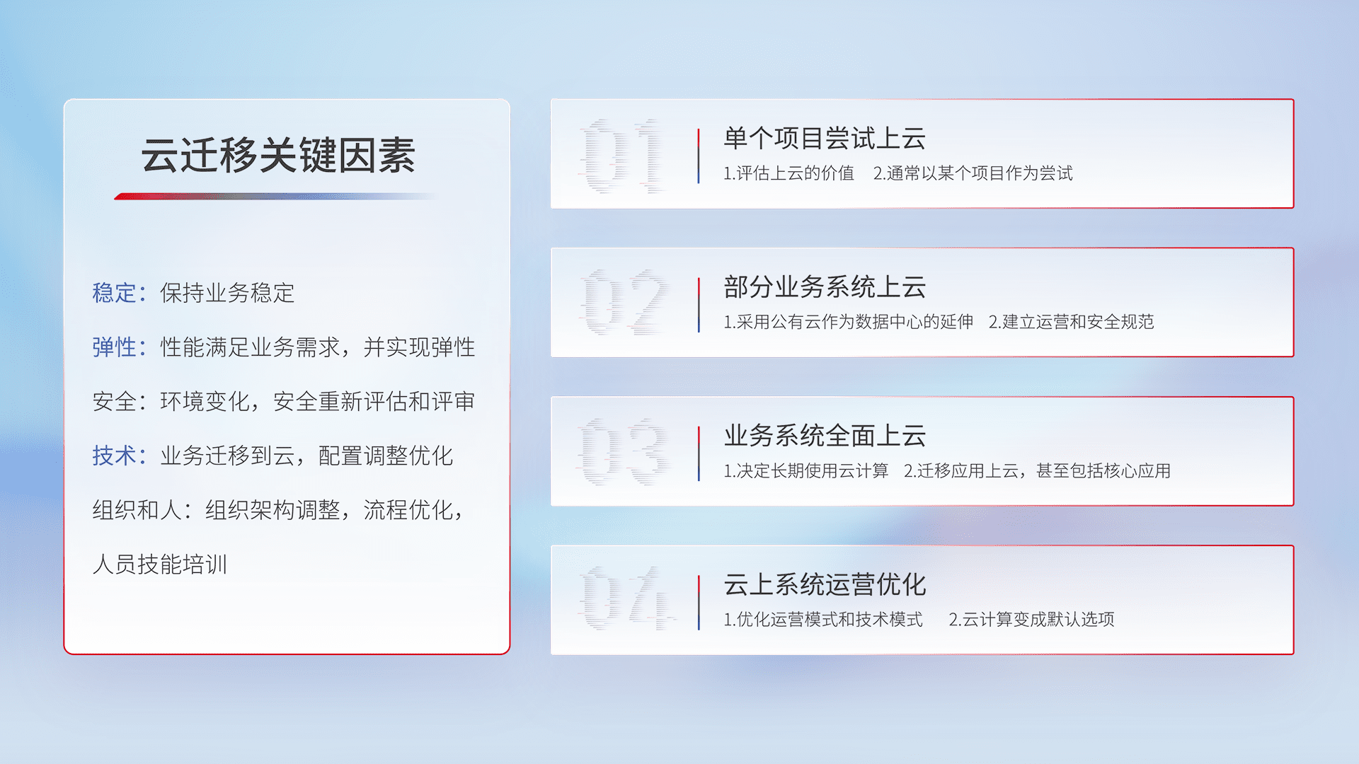 结合实际业务,,从规划设计、、、云平台选型、、、云原生改造、、、、数据迁移、、、集成交付,,迁移全过程为客户识别最佳上云路径,,做好风险识别管理,,,设计网络架构、、、、身份权限、、安全审计合规、、、操作审计、、、、日志审计、、、监控告警策略、、、多站点容灾设计等,,对云上基础设施进行整体规划,,提升IT治理水平,,,以满足弹性、、高可用、、高性能的需求。。。。