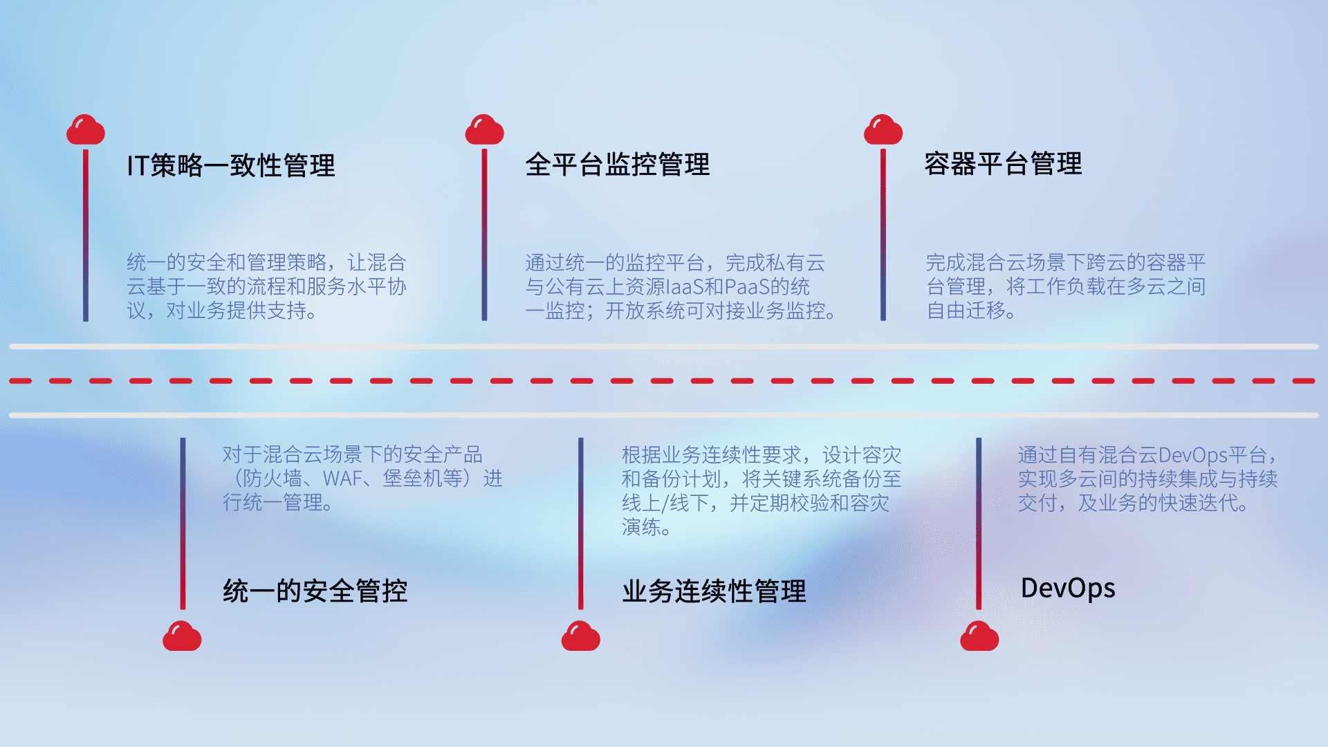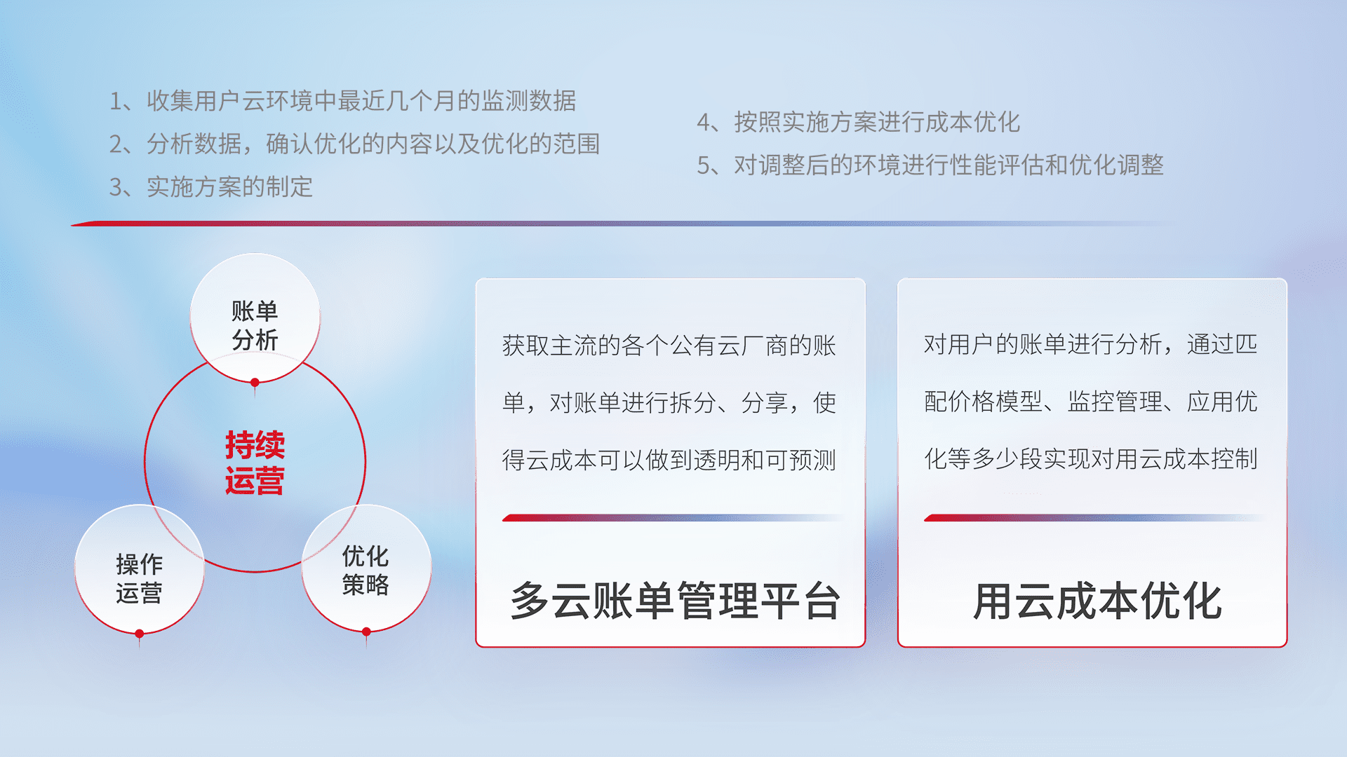 通过多云纳管,,以统一的资源数据模型把客户的云资源进行抽象和封装,,进而实现对多云资源的统一操作,,,保障云资源管理的可靠性、、稳定性与可用性。。量身定制化运维内容,,配置、、、开发运维、、补丁管理、、、备份、、监控、、、、认证和访问管理、、、、审计和日常巡检等,,保障在用云过程中的可靠度,,,,稳定度以及高可用率。。。。
